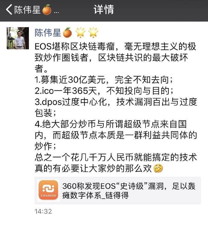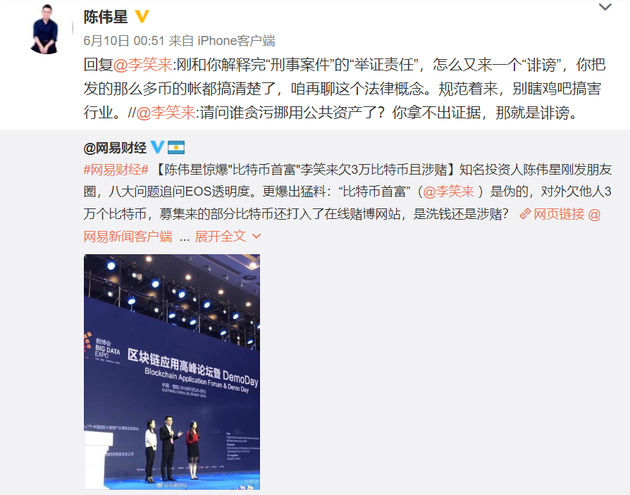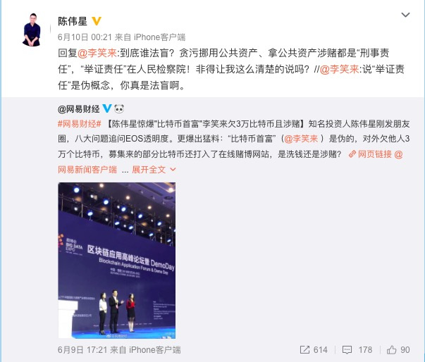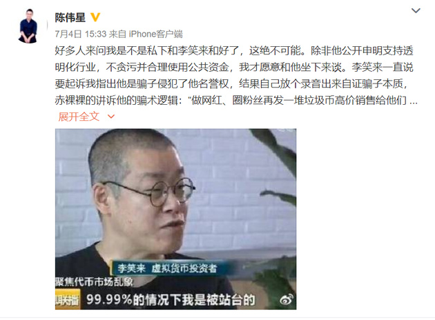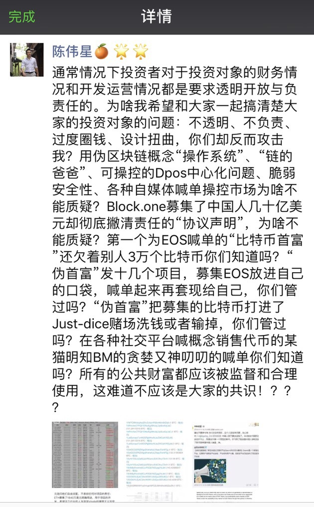 6月8日,陈伟星再度火力全开,在朋友圈以追问EOS透明度为由,爆出李笑来欠别人3万个比特币,称李笑来为项目喊单是为了套现。