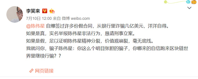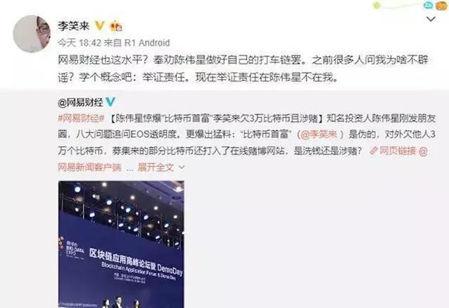 凌晨3时,李笑来对《“陈伟星惊爆“比特币首富”李笑来欠3万比特币且涉赌”》报道配文回应:全篇虚假信息,无凭无据,信口雌黄,诽谤。已移交律师处理。
