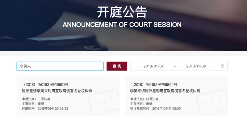 10 月 11 日上午 9 时 19 分,李笑来诉陈伟星互联网侵害名誉权纠纷案件((2018)浙0192民初6804号)在杭州互联网法院开庭质证。本次庭审案件中,李笑来为原告,陈伟星为被告。