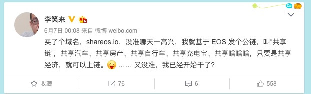 李笑来也拍板而起,发布微博:“买了个域名,shareos.io,没准哪天一高兴,我就基于EOS发个公链,叫共享链,共享汽车、共享房产、共享自行车、共享充电宝、共享啥啥啥,只要是共享经济,就可以上链。又没准,我已经开始干了?”