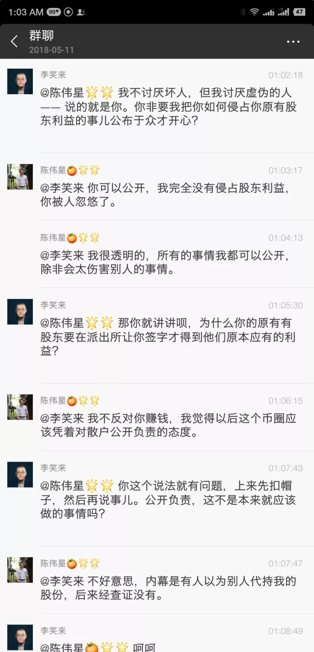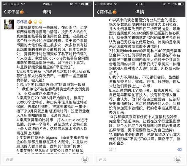 随后,两人在微博上的争吵告一段落。口舌斗争消停时日后,6 月 13 日晚,陈伟星再度在朋友圈向李笑来发锤。他发布十一个例证要点,解释李笑来欠下3万个比特币一说的由来,并且指责李笑来虚构“比特币首富”形象,称李笑来让他在这个行业混到想吐。