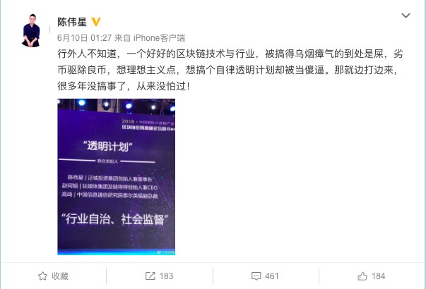 6 月 10 日凌晨 1 时,陈伟星发博称推出区块链透明计划,愿景是“行业自治,社会监督”。