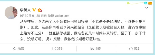9 月 30 日,李笑来宣布个人不再做任何投资,花几年时间认真转行。