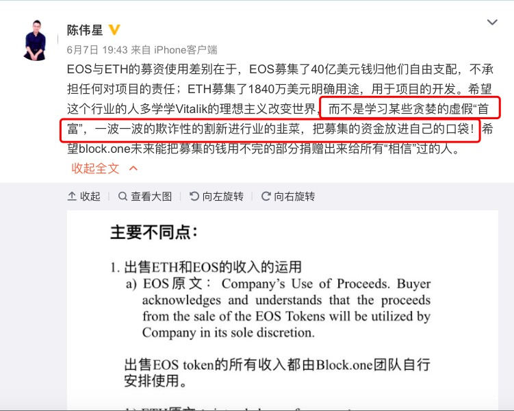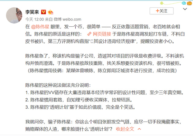 但随后陈伟星发表的有关EOS的微博中,不断暗指比特币首富李笑来“割韭菜”、“把钱装进自己口袋”。
