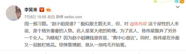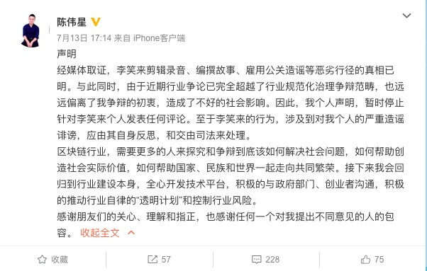 7月13日,陈伟星发表声明,称停止针对李笑来个人发表任何评论,将交由司法处理。尽管如此,一直到10月3日,陈伟星在日常更博的同时,依旧有暗怼李笑来之意,将李称呼为“李首骗”。