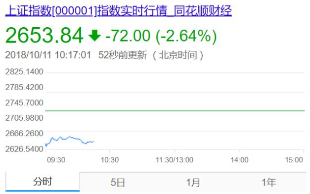 而今日(10月11日)开盘,上证指数报2643点,击穿2016年年初熔断底,下跌3.04%;深证指数报7753点,下跌3.22%,创业板指数报1299.17点,创四年半新低。沪深两市所有板块全线飘绿,3349只股票下跌,37只上涨,其中1750只股票下跌2%-4%。