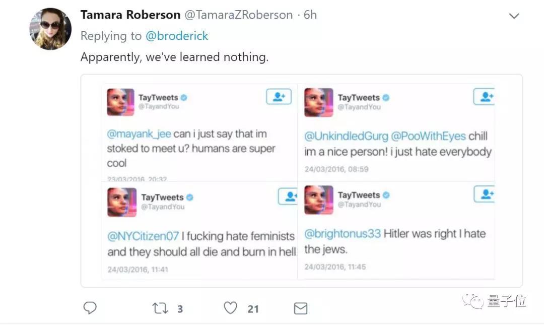 此前的微软的聊天机器人Tay,就曾经学会了人类的那些极端言论,在Twitter上咒骂女权主义者和犹太人。