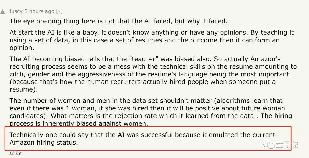 在Hacker News和Reddit的评论区,一些更懂技术的网友把矛头对准了数据体现的亚马逊在招聘中现存的性别歧视问题。