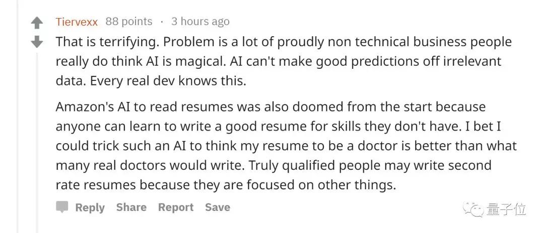 “亚马逊阅读简历的AI从一开始就注定了要失败,因为任何人都可以去学习怎样写好一份简历。让我写一份医生的简历,我打赌我会比真医生写的要好。”