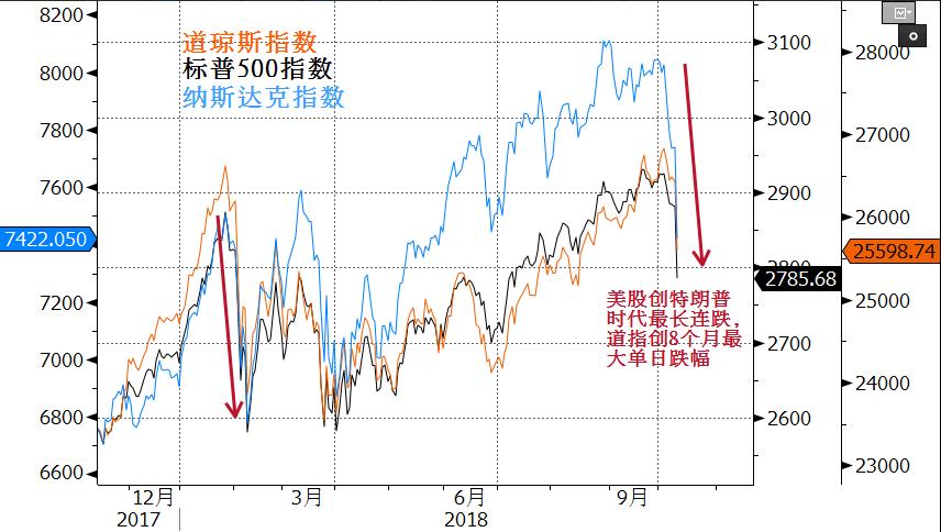 标普500指数跌3.3%,报2785.68点,创出八个月最大跌幅, 为2016年11月以来首次出现五日连跌,令其较9月20日创下的历史高点大跌5.0%左右。自6月27日以来,该指数首次跌破100日均线。