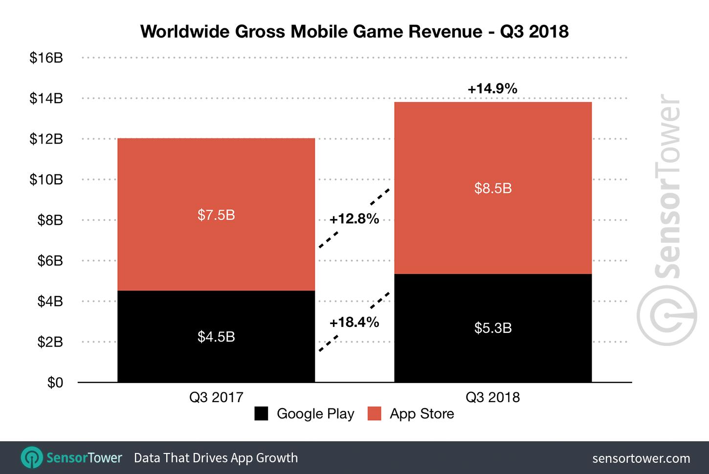 从两家应用商店的收入构成来看,来自手机游戏应用的收入是最重要的收入来源,2018年第三季度,这部分营收达138亿美元,占全球所有应用程序营收的76%。其中,App Store上的手机游戏业务收入为85亿美元,同比上涨12.8%,占整个应用商店收入的70.8%;Google Play上的手机游戏营收同比上涨18.4%,达53亿美元,占其整个应用商店收入的85.5%。