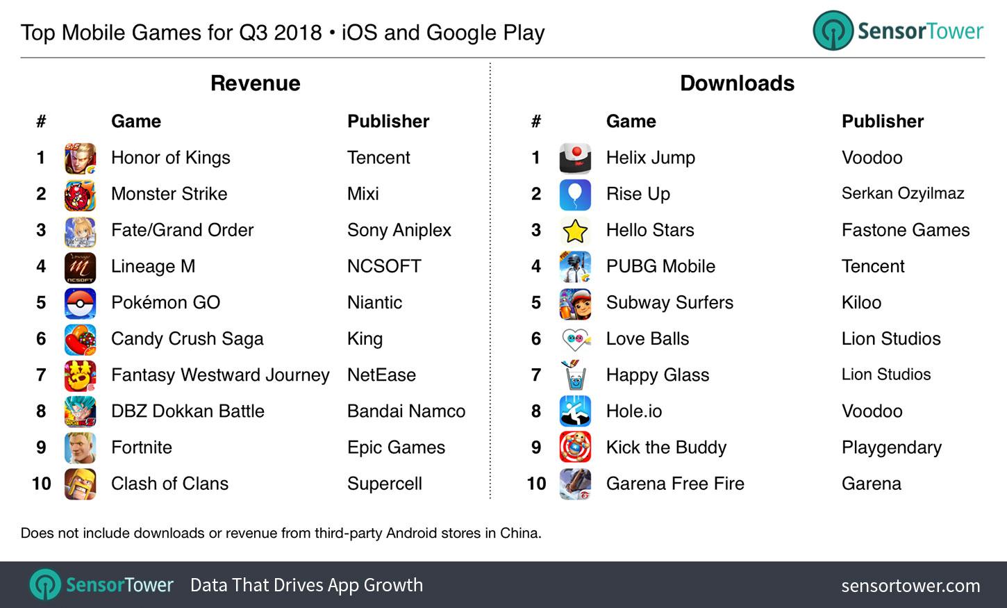 2018年第三季度全球手机游戏应用收入和下载量排名(来源:SensorTower)