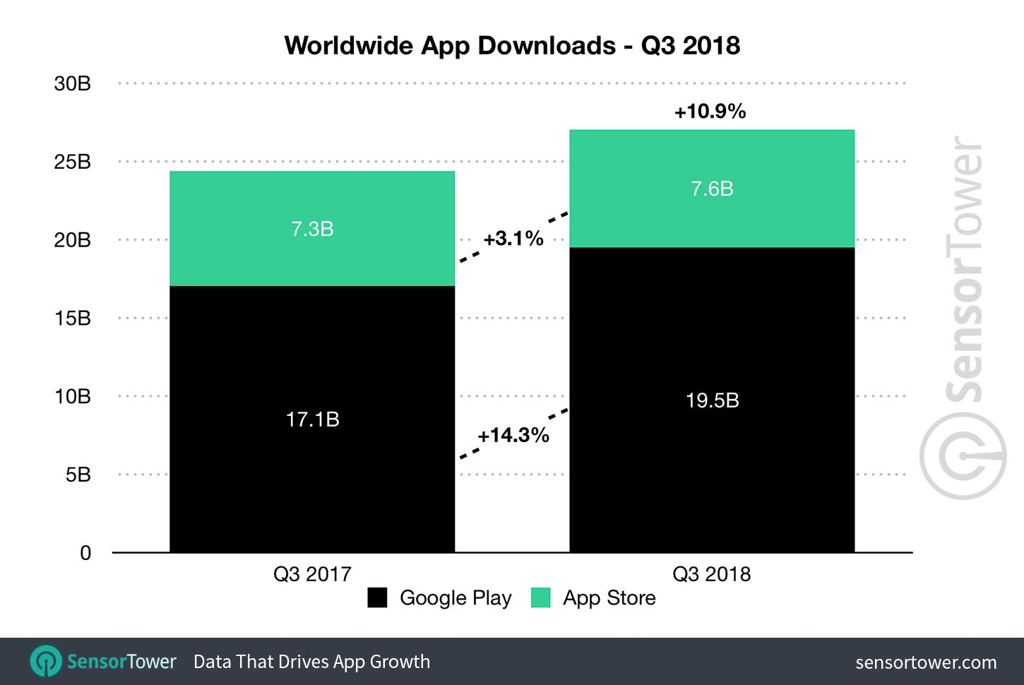 SensorTower的数据显示,2018年第三季度,两家应用商店的程序下载量同比增长10.9%,达271亿。其中,Google Play的下载量达195亿,同比增长14.3%;App Store的下载量则为76亿,同比增长仅3.1%,不及谷歌的40%。