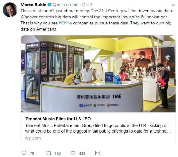 美国参议员马克卢比奥在十月初发推特称,“以腾讯音乐IPO为代表的这些交易不仅仅事关金钱利益。大数据将是21世纪最主要的推动力,因此控制大数据的人将控制重要的行业和创新。 这就是为什么你看到中国公司追求这些交易,他们希望拥有美国人的大数据”。