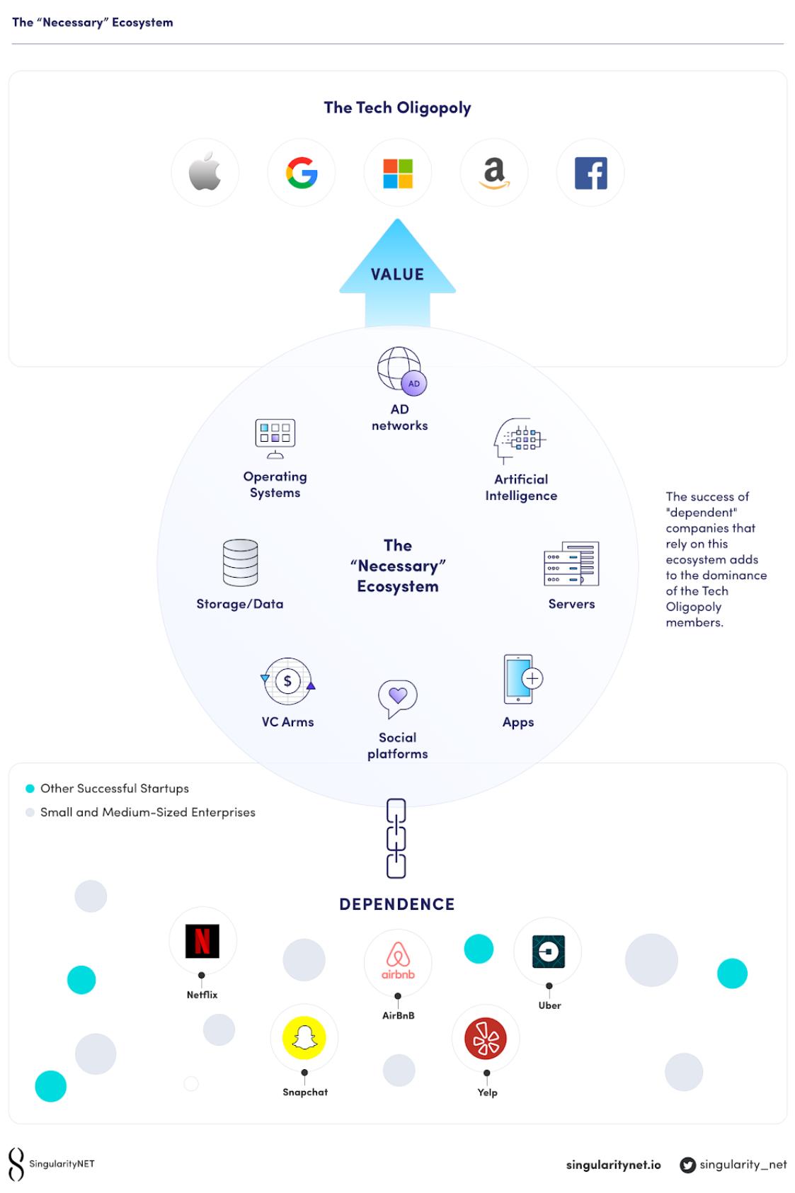 随着世界变得越来越数字化,技术寡头们建立了一个个生态系统,使自己变得越来越重要。比如服务器云,广告网络,应用程序商店,操作系统,社交平台等等。 云计算的兴起使得这种生态系统成为可能,几乎所有成功的创业公司都要使用现有科技行业寡头的服务。