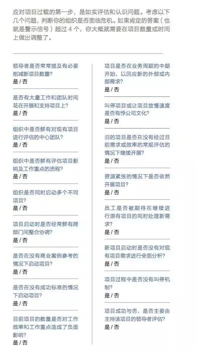 这些例子表明,应对项目过载问题,需要意愿和原则来推动困难的抉择。以下指导步骤供参考: