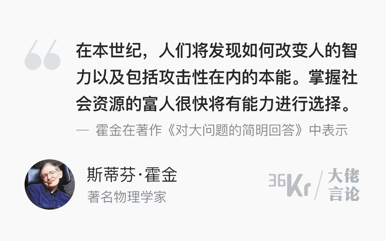 霍金在书中提到,“在本世纪,人们将发现如何改变人的智力以及包括攻击性在内的本能。掌握社会资源的富人很快将有能力进行选择。”