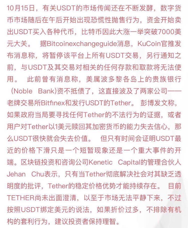 针对今日 USDT 大跌,肖磊表示,USDT 背后是有美元资产的,目前我们不能确定的是比例关系,所以完全崩盘的可能性也不大。USDT 虽然是稳定币,但存在信用风险和系统风险,这种风险不亚于其他币种的价格风险,因此虽然 USDT 不会归零,但如果出现巨大的挤兑风险,信用机制丧失,可能价格会出现一个明显的下跌。稳定币跟法币的兑换并没有建立起来一个顺畅的机制,因此 USDT 一旦出现信用危机,首先投资者会将其兑换成比特币、以太坊等数字货币,而不是美元,从而导致比特币等价格的大幅上涨。