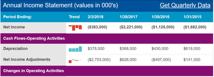 根据纳斯达克官网的数据整理,西尔斯近几年的主营业务亏损幅度惊人。2016财年(截至2017年1月28日)西尔斯主营业务亏损高达22.2亿美元。西尔斯上一次盈利年份是2011年,自2011年以来西尔斯累计亏损逾110亿美元。西尔斯的雇员人数,也从10年前的32万人,下降到6.8万人,十年间关闭的店铺超过1000家。