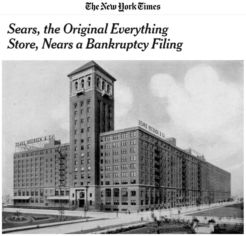 上周日(14日),纽约时报、华尔街日报等媒体援引内部消息人士报道,“百年老店”西尔斯百货(Sears)将在美国时间本周一(15日)正式提交破产申请文件。