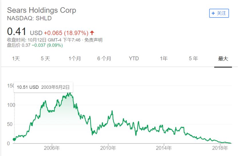 从股价上看,2007年4月,西尔斯百货股价曾冲上144.1美元的顶峰,而在2018年10月14日,西尔斯百货股价跌到0.41美元,成为名副其实的“仙股”。