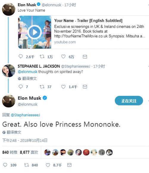 硅谷钢铁侠马斯克做出劲爆宣言,自称埃隆酱(Elon-chan),甚至要造一台机甲。具体来说,这次自曝从他点赞《你的名字》开始。马斯克还表示喜欢看《千与千寻》和《幽灵公主》,且能答出《新世纪福音战士》特务机关名称NERV。