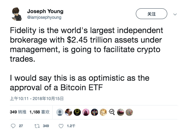 对于富达集团推出富达数字资产一事,福布斯的分析师 Joseph Young 也连夜发推称:这将会促进加密交易。(富达数字资产的成立)就像比特币交易所交易基金(Bitcoin ETF)获得批准一样使人乐观。