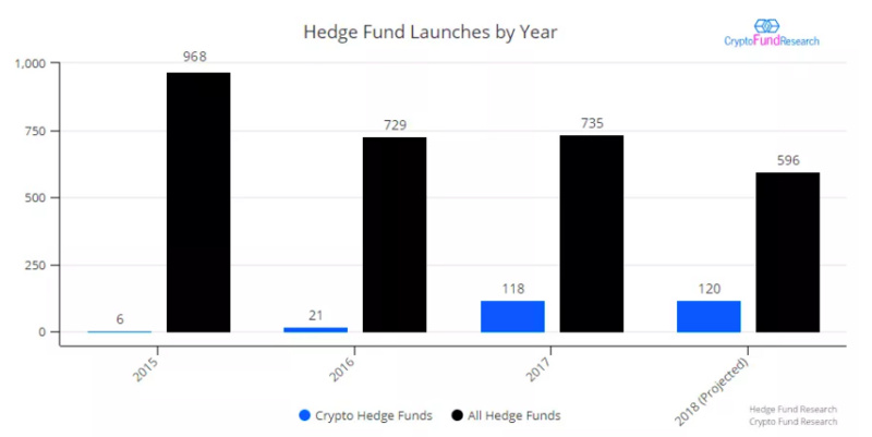 对冲基金的新成立数量在今年达到历史之最。据 Crypto Fund Research 2018年总共将有600家对冲基金推出,其中 20% 即 120 家是加密对冲基金。(不过增速明显不及去年,彭博在今年 4 月反而认为一季度“只有” 20 家新成立的 Crypto Fund,展现了相反的情绪。)再者,据 the information 报道,哈佛大学、斯坦福大学、MIT等五所大学旗下的捐赠基金在加密货币基金上投入了数千万美元;控制着全美规模第二大的耶鲁大学基金已将部分资产投资于由 Andreessen Horowitz(a16z)和 Paradigm 运营的两个加密货币基金。另据多名业内人士透露,不少传统金融中的巨头,都在申请相关法币牌照。