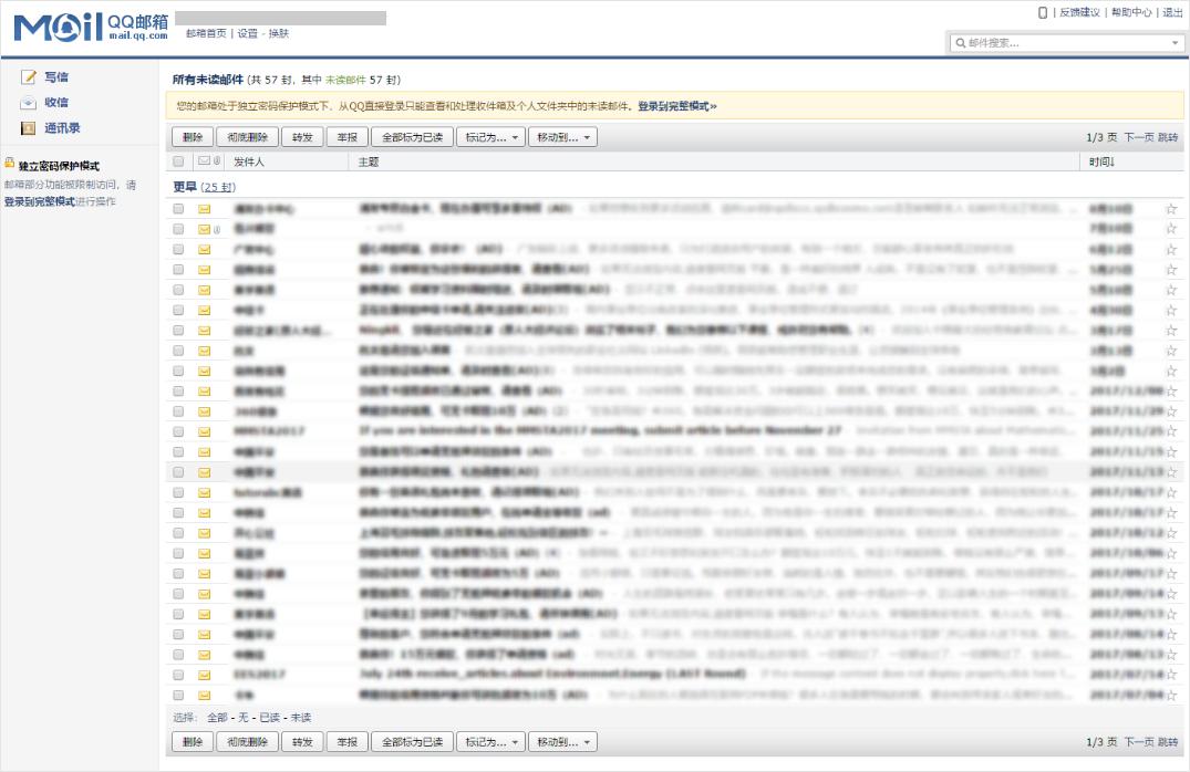 但是,如果作为邮箱的重度用户,QQ邮箱的体验是无与伦比的。QQ邮箱在1080高度的显示器上,能在一页显示完整个列表。对于经常要按时间找邮件的人,非常方便。哪怕在小一点的屏幕上,也只要稍微滚动一下鼠标滚轮,就能看全。