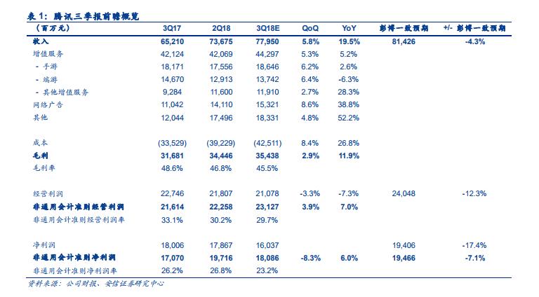 “预计三季度公司收入同比增加 19.5%至 779.5 亿元,比彭博预期低 4%,主要由广告和其他业务增长驱动。调整后净利润同比增加 6%至 181 亿元,比彭博一致预期低 7%,调整后净利率为 23%”,安信证券表示。