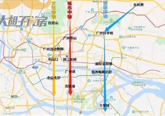 目前广州的城市就是由三条中轴支撑起来的:文化中轴(学区房)、城市中轴(地段和景观好)、创新中轴(近郊产业群),他们所对应的卖点也是不一样的。