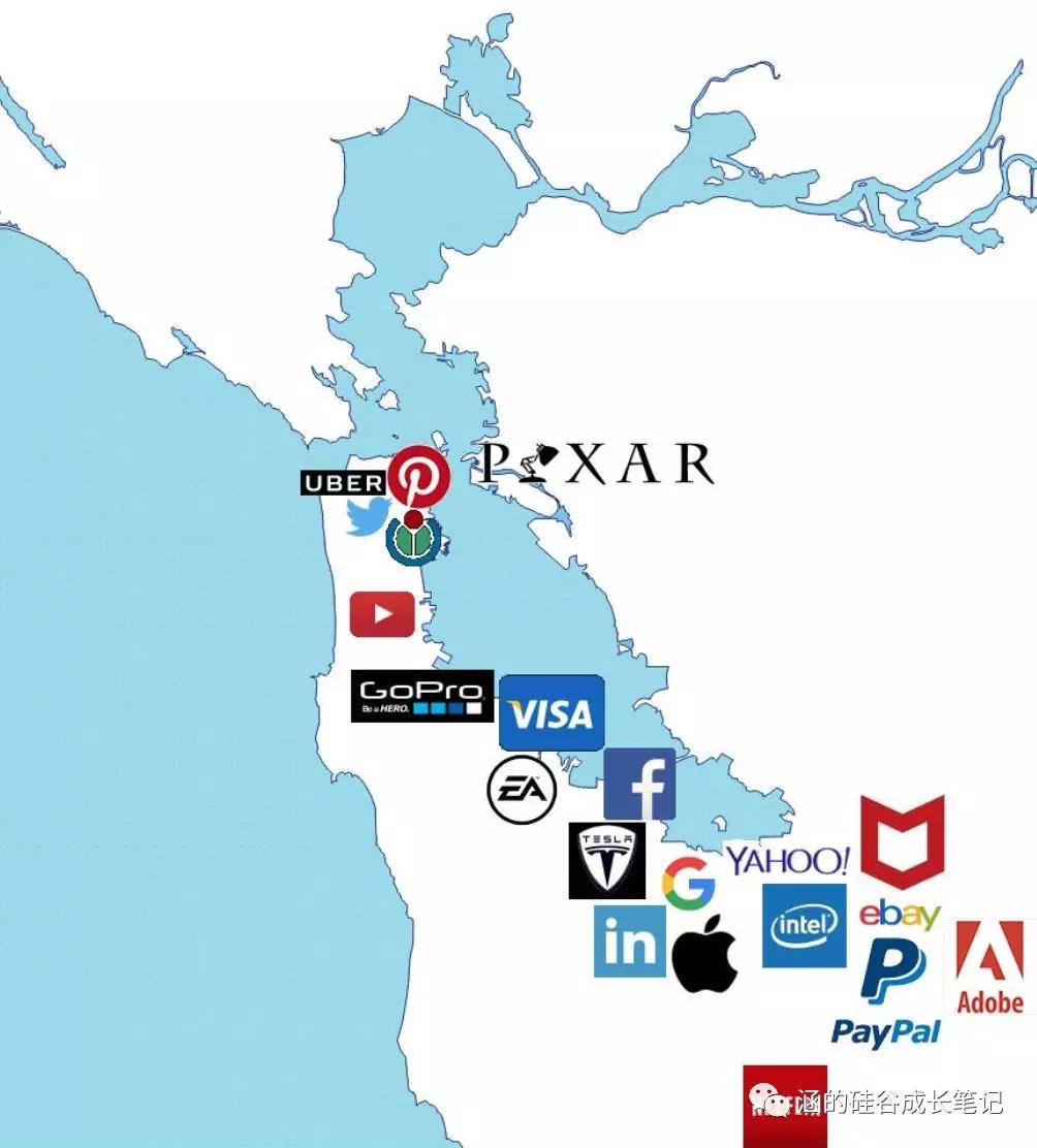 旧金山市中心,有着明星创业公司Uber, Airbnb, Pinterest等;而南湾的硅谷,则云集facebook,Google,Apple等各路大型科技企业。