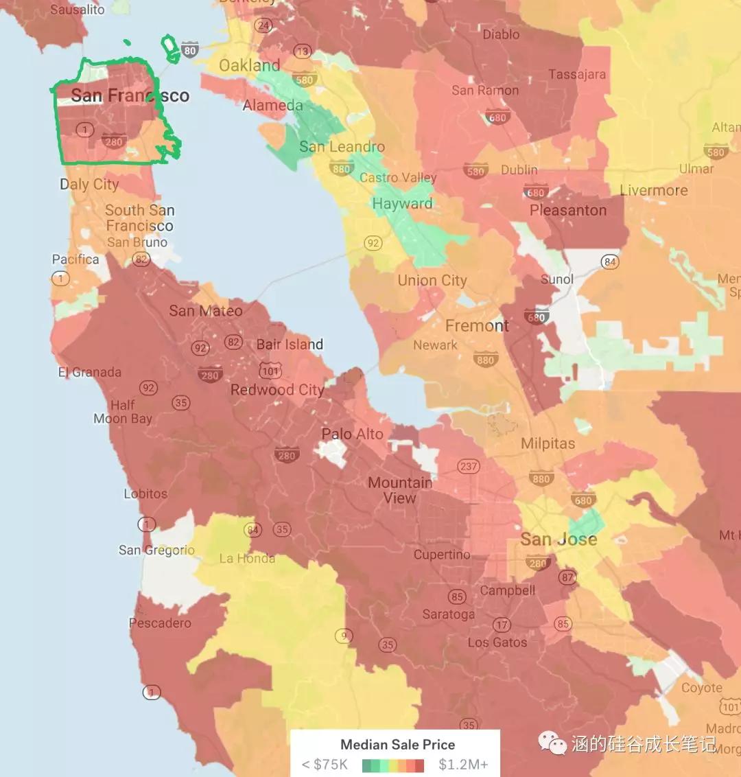 而图中颜色最深的部分,除了旧金山市中心以外,就是传统意义上的硅谷了,这里聚集着大量的工作机会。