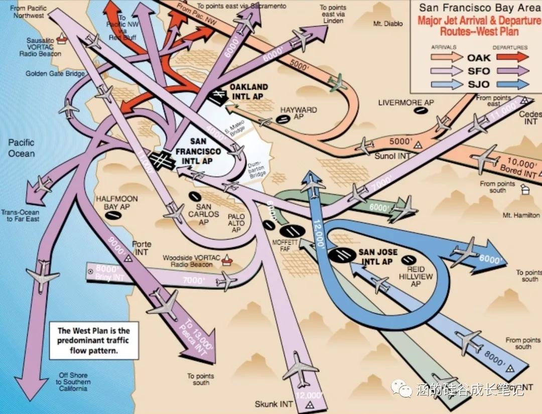 在湾区,不算小型机场的话,仅大型国际机场就有三个之多:旧金山国际机场(SFO),圣何塞国际机场(SJC)和奥克兰国际机场(OAK)。每天在这里起降的国内国际航线几乎把航路全部占满。
