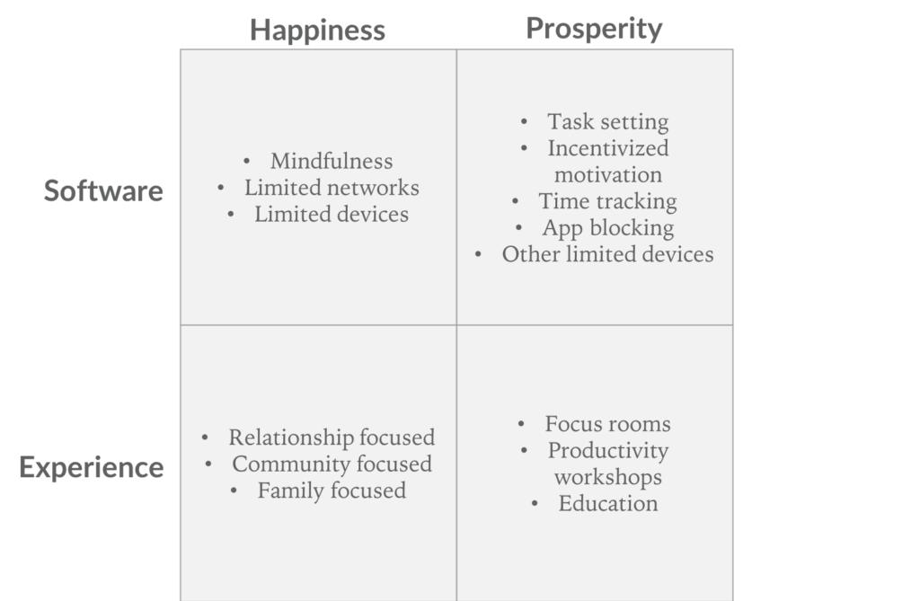 总之,我们提到的两种类型的解决方案:基于软件的解决方案和基于体验的解决方案。它们都能够提供两个核心好处:更容易得到的快乐感和更高的成功概率。