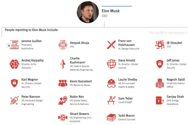 特斯拉扁平化的管理结构最近似乎变得更加平坦,因为一些重要高管的离职,导致比较多的人员直接向CEO马斯克汇报工作。