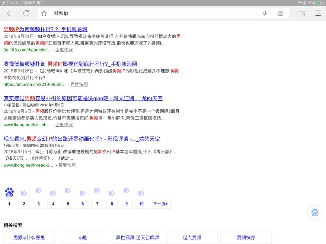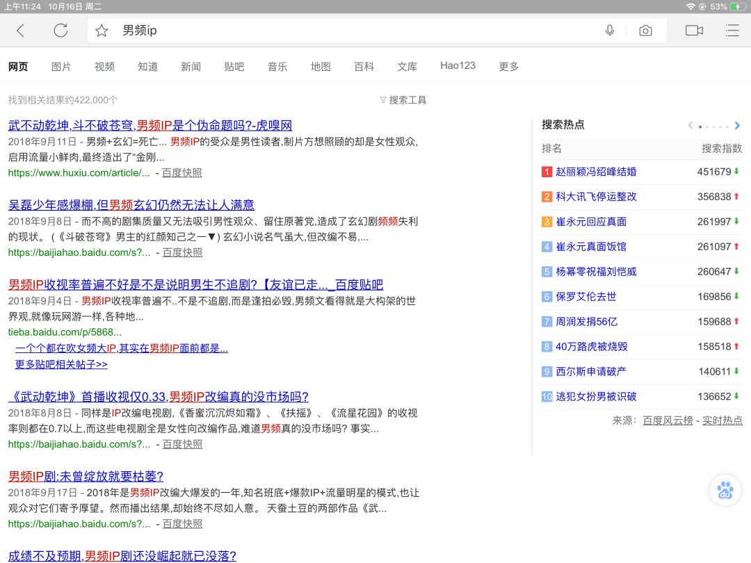 然而现实十分打脸。在百度搜索框输入“男频IP”,出来的是能够让男频作者沉默的结果。