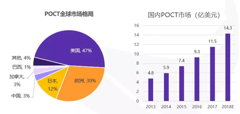 国内POCT市场保持高增速:国内POCT起步较晚,市场基数相对较小。根据Rncos的数据显示,2017年我国POCT市场规模为11.5亿美元,预计到2018年将达到14.3亿美元,年均复合增速高达24%。国内主要POCT生产商万孚生物、基蛋生物、明德生物等近年来保持较快的业绩增长,平均增速在30%以上。
