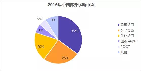 体外诊断按其检测方法或检测原理可分为生化诊断、免疫诊断、分子诊断、微生物诊断、血液诊断等诊断方法,其中生化、免疫诊断是目前国内体外诊断的主要临床应用方法,现阶段占据整个体外诊断市场60%的份额。