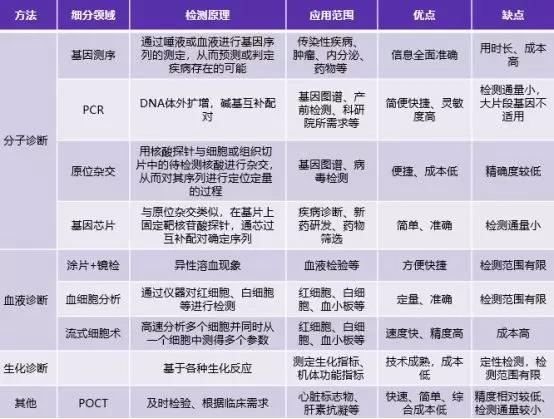 分子诊断是指应用分子生物学方法检测患者体内遗传物质或基因产物表达水平的变化而做出诊断的技术。作为体外诊断行业中技术最前沿、诊断精密度最高的技术,分子诊断已经广泛应用于产前筛查(NIPT)、传染病、肿瘤等领域,目前应用于临床的主要有PCR(聚合酶链式反应)、基因测序和基因芯片技术等技术。