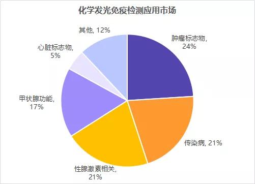 肿瘤标志物检测是发展潜力最大的应用领域:化学发光免疫检测广泛应用于肿瘤标志物、传染病、性腺激素等相关检测,目前占比最大的是肿瘤标志物检测。