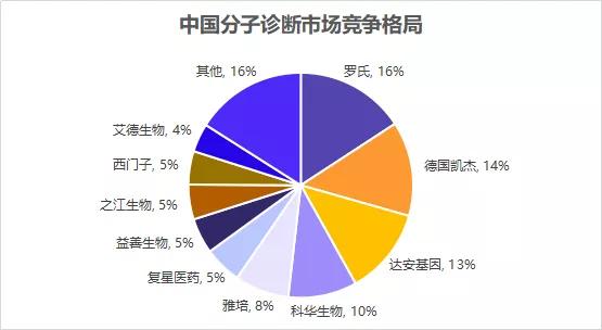 国内分子诊断行业集中度相对较低:由于国内分子诊断市场仍处于发展前期,海外巨头的渗透率相对较低,并且分子诊断技术的临床应用还未完全成熟,未成为体外诊断的主流技术,因此国内市场竞争格局较为分散,达安基因、科华生物等一批分子诊断企业占据了一定的市场份额,有望与海外巨头抗衡。