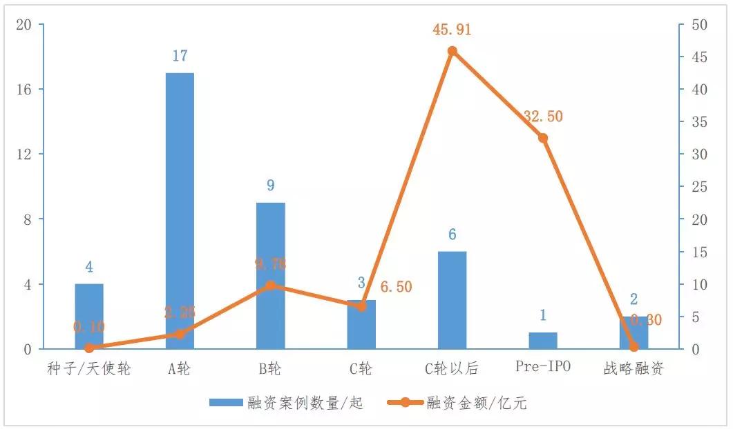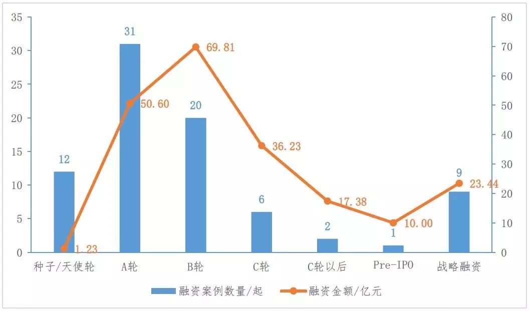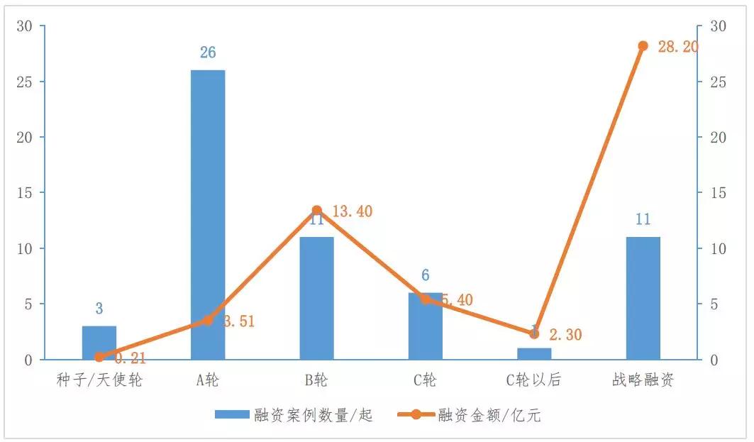 从投资阶段看,融资案例主要集中在A轮阶段。A轮阶段融资案例26起,所占比重为44.8%,其中过亿元融资案例3起,如环生医疗、掌中医、五色科技等企业;战略融资阶段融资案例11起,所占比重为19.0%,其中过亿元融资案例2起,如美中嘉和、香港亚洲医疗等企业。