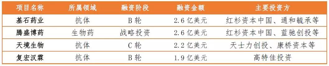 完成过亿元融资的案例有42起,占比过半,共计完成融资金额204.86亿元,占比达98.2%。其中有7起案例融资金额超过十亿元(详见下图),基石药业完成2.6亿美元B轮融资、腾盛博药完成2.6亿美元战略融资是今年以来药品领域金额最高的融资。