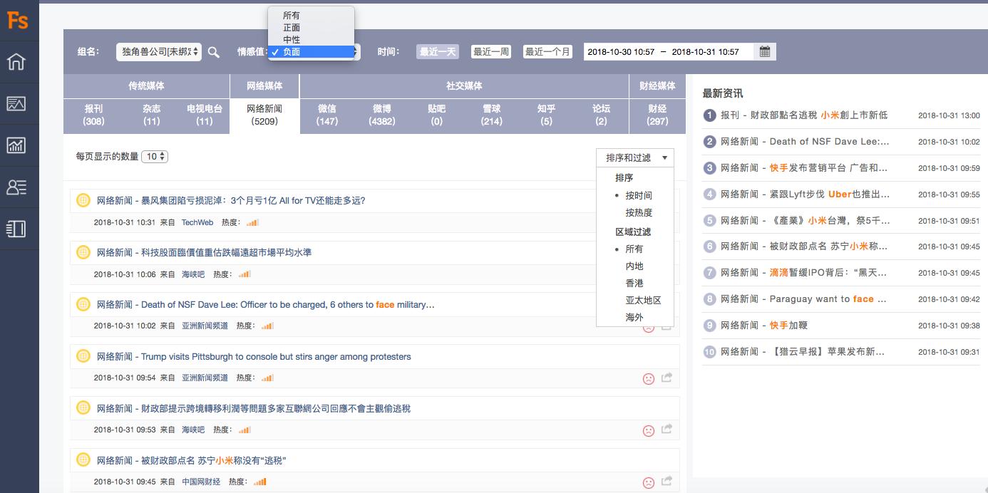此外,Farseer 还与财新网合作推出了“港股上市公司敏感指数”,覆盖 2000 多家港股上市公司,实时对舆情、市场、研究数据进行跟踪分析,每日筛选市场最关注的 10 个事件,每周回顾。