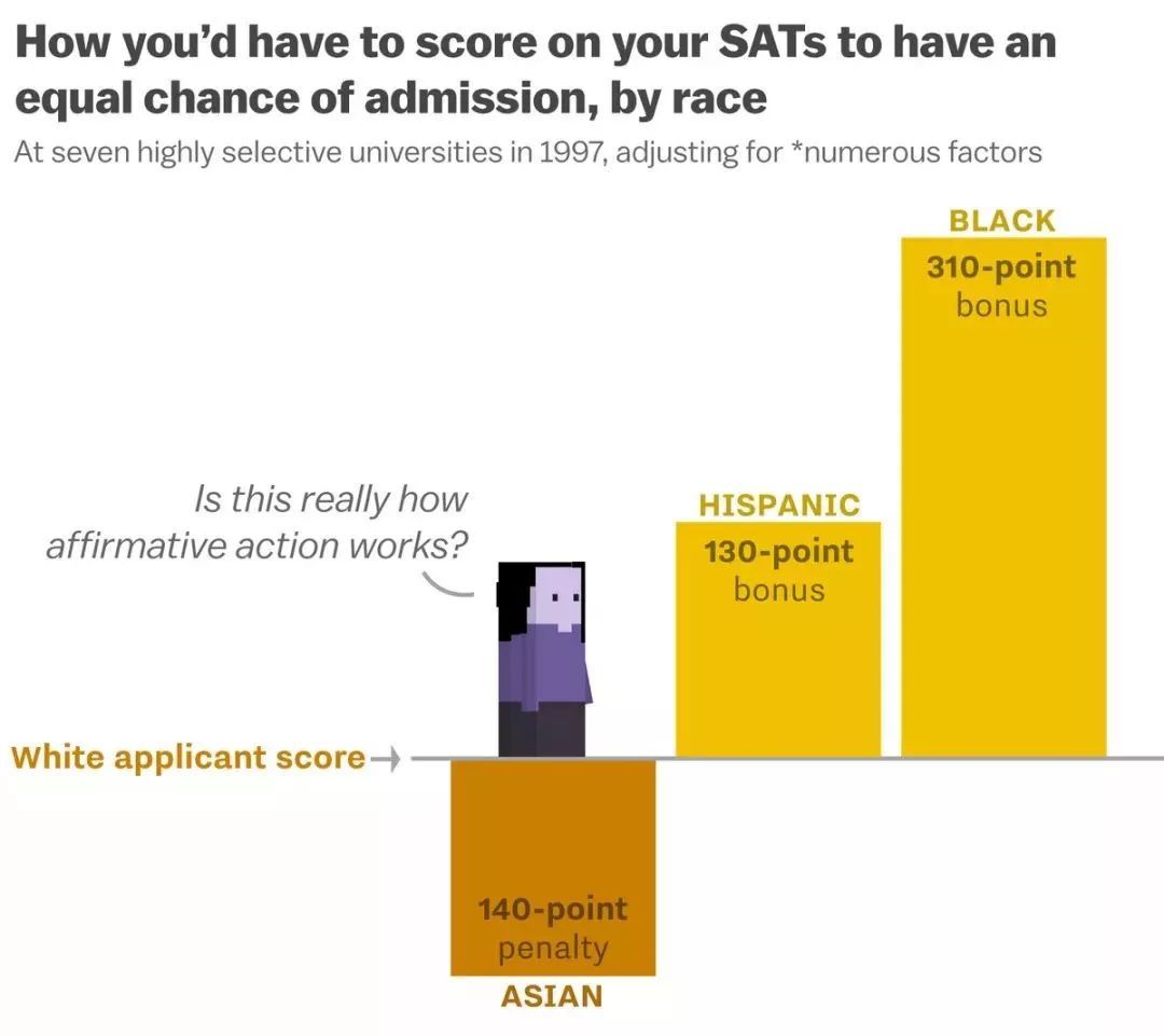 普林斯顿大学的研究表明,亚裔高中生在SAT考试中,成绩需要比白人高140分,比拉丁裔高270分,比非裔高450分,才有可能获得同样进入常春藤名校的机会。