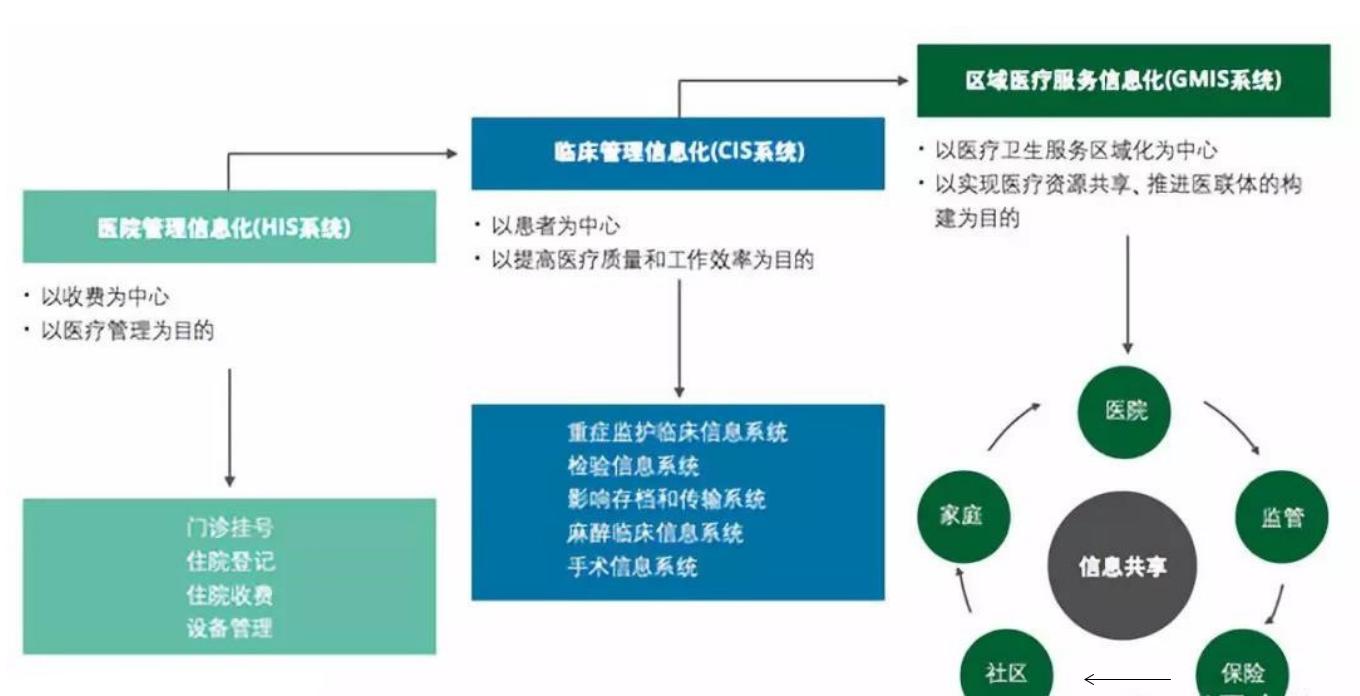德勤中国健康医疗变革报告中分析,目前中国医院信息系统的主要趋势是在“以收费和医院管理为核心的传统医院信息系统(HIS)上慢慢向 “以患者和提高服务质量为核心” 的临床信息系统(CIS)上转型升级。待升级完成后,未来再向区域化卫生服务系统(GMIS) 上升级,最终实现信息和资源共享的医联体,达到医疗信息的互联互通。
