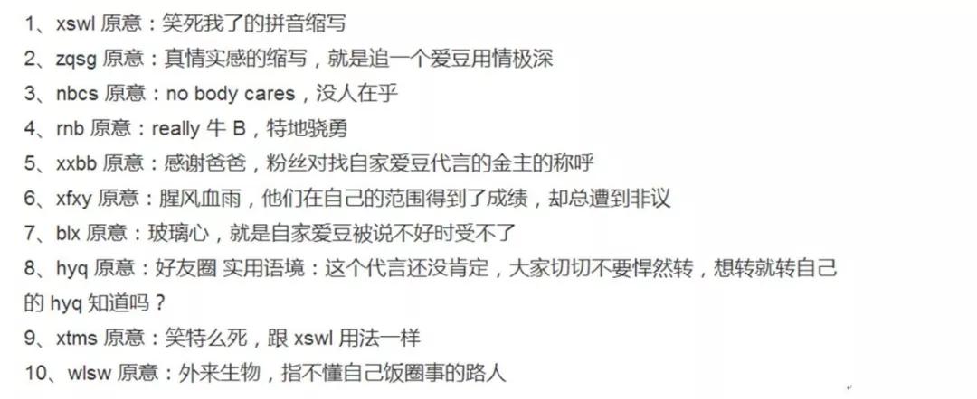 如今缩写体被新一代少男少女广泛运用于QQ空间、贴吧、微博的“扩列”行为中,也成为饭圈粉丝的普遍用语习惯。替代性语言的使用反映了群体文化的需要:他们需要一种语言来确认成员身份,参与他们的社会和文化社区,以及确认群体的社会身份和他们在社会中的位置。