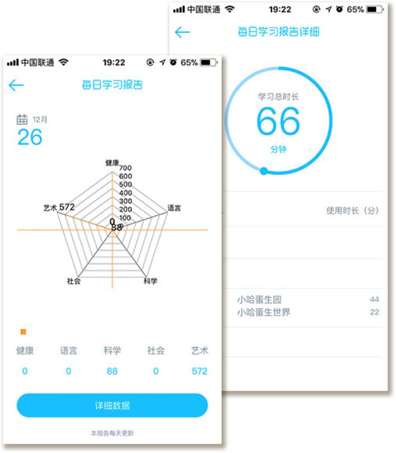 配合小哈机器人,在手机 APP 端,家长可以看到孩子的学习记录和学习报告。