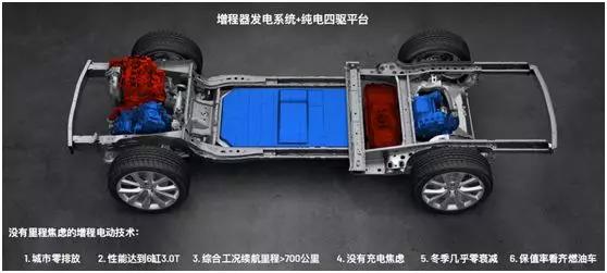增程式电动车的底盘是纯电动车底盘,以“三电”系统为基础,在这上面加发动机、减速器、发电机等。